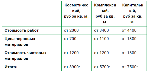 * обращаем внимание, что цены за квадратный метр зависят от многих факторов. В таблице указаны средние расценки на основе выполненных работ у наших клиентов. Более точную сумму можно будет назвать только после замера и составления окончательной сметы.